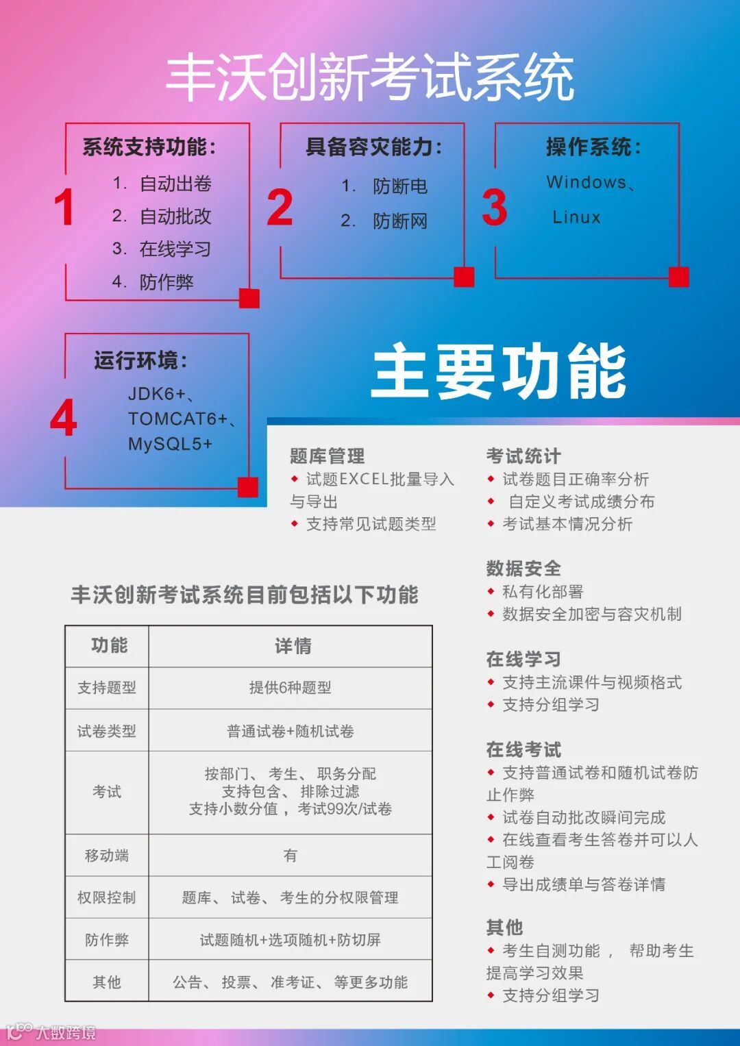 网络考试系统是利用网络的广阔空间,将考场延伸到任何网络覆盖的区域,实现传统考试与现代科技完美结合的一种考试形式。它具有以下特点和功能: