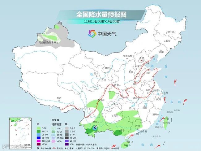 13日,新疆北部等地部分地区有小到中雪或雨夹雪,局地大到暴雪(10~12毫米)。湖南南部、四川盆地、贵州南部和东部、云南大部、广西、广东北部、海南岛、台湾岛等地部分地区有小到中雨,其中,云南中部局地有大雨(25~45毫米)。