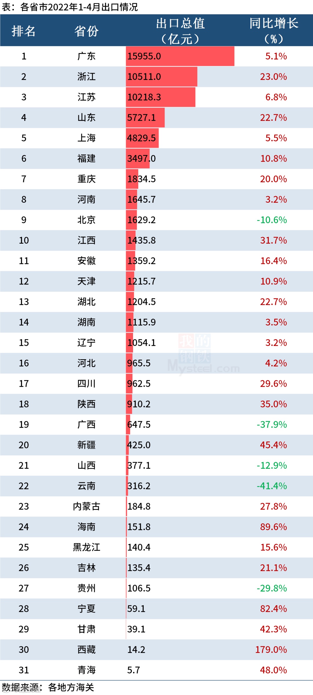1-4月进出口总值突破万亿元的省市有5个,分别是广东、江苏、浙江、上海、北京。如果从出口方面来看,今年前4个月,我国出口6.97万亿元,同比增长10.3%。