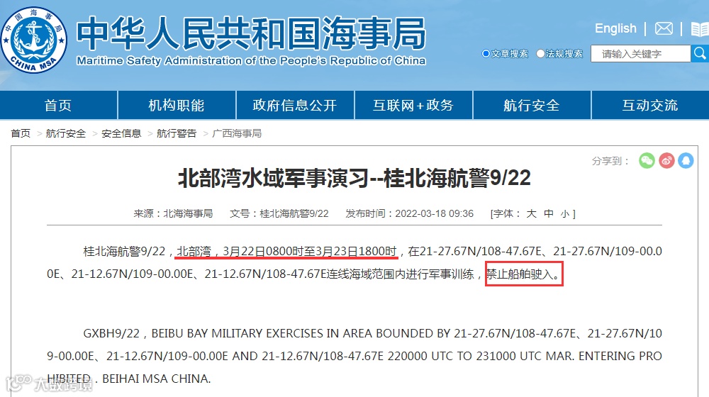 据海南海事局 :南海,自2022年3月19日0900时至4月9日1800时在