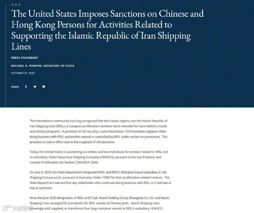 美国国务卿蓬佩奥在一份声明中声称:“今天,我们再次向全世界的利益相关者发出警告:如果你和IRISL做生意,你将面临被美国制裁的风险。”