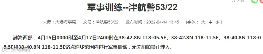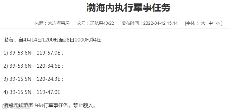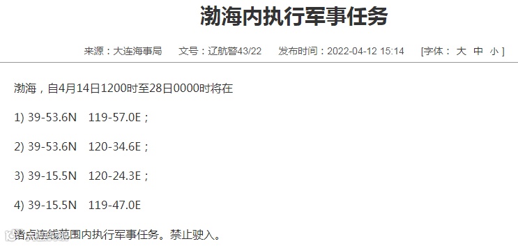 渤海,自4月14日1200时至28日0000时将在1) 39-53.6N 119-57.0E;2) 39-53.6N 120-34.6E;3) 39-15.5N 120-24.3E;4) 39-15.5N 119-47.0E诸点连线范围内执行军事任务。禁止驶入。