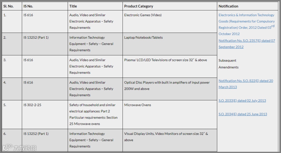 目前,印度已就《电子和信息技术产品(强制注册要求)2012法令》发布4批产品目录,将56项信息、家电、影音、灯具产品纳入强制注册要求。对于这些产品,法令要求必须在印度BIS认可的实验室进行相应标准的测试及注册,本体或外包装上加贴BIS标志等。