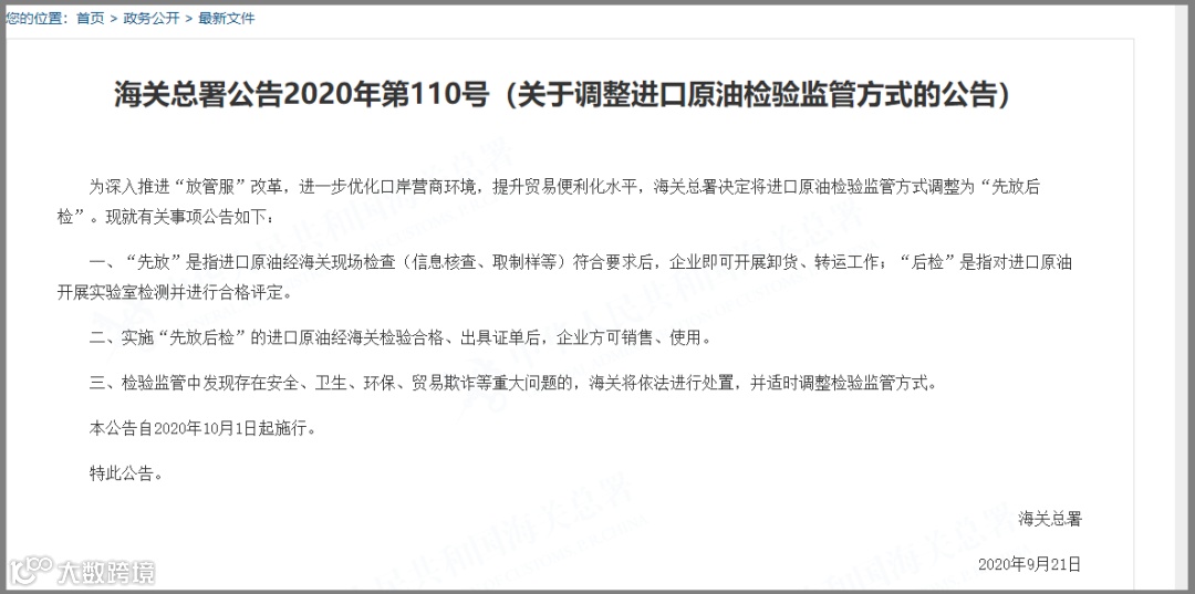 为深入推进“放管服”改革,进一步优化口岸营商环境,提升贸易便利化水平,海关总署决定将进口原油检验监管方式调整为“先放后检”。现就有关事项公告如下: