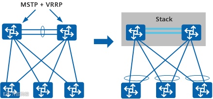 简化组网 如下图所示,网络中的多台设备组成堆叠,虚拟成单一的逻辑设备。简化后的组网不再需要使用MSTP等破环协议,简化了网络配置,同时依靠跨设备的链路聚合,实现单设备故障时的快速切换,提高可靠性。
