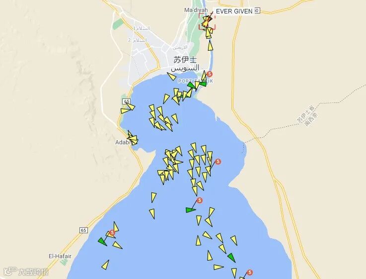 据报道,“EVER GIVEN”轮后的15艘船只被迫停留在原地,船迅网的信息显示,数十艘船正在排队等待进入运河,南下的船队的航道也被封锁了。