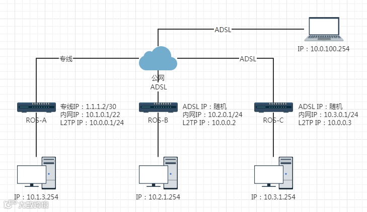 当前环境是A总部,RouterOS(ROS-A)当作主路由,使用的是CCR1009,100M专线;B工厂,RouterOS(ROS-B)主路由,使用的是J1900软路由,200M商宽;C办事处,RouterOS(ROS-C)主路由,使用的是J1900软路由,200M商宽,各自上网不互通。