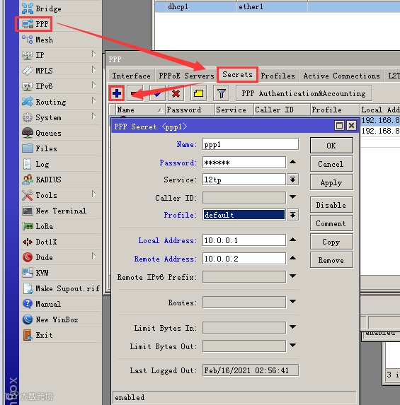 2、配置L2TP账号,PPP --> Secrets --> +,分别为分厂添加账号