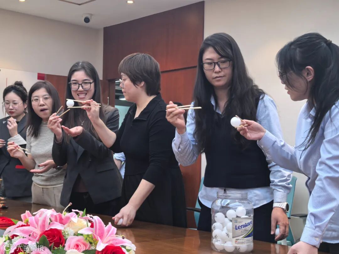 当然,最“燃”的当属“龙珠”接力赛”!三组队员手持长筷,化身“运粮小龙”,夹着圆滚滚的乒乓球(龙珠)你传我接,4分钟里手抖、憋笑、欢呼声此起彼伏,最终获胜队伍获得了寓意“福气缠绕”的红绳手链,瞬间喜提全场羡慕眼神!