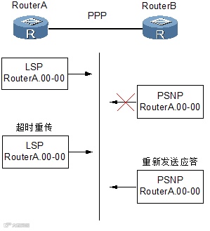 · 假定RouterB向RouterA索取相应的LSP。RouterA发送RouterB请求的LSP的同时启动LSP重传定时器,并等待RouterB发送的PSNP作为收到LSP的确认。