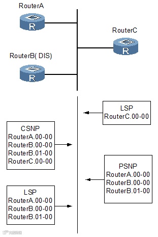 · RouterA先与RouterB建立邻居关系之后,RouterA与RouterB会先发送CSNP给对端设备。设备会根据CSNP中的LSP头信息来检查自己的LSDB中是否缺少相应的LSP。