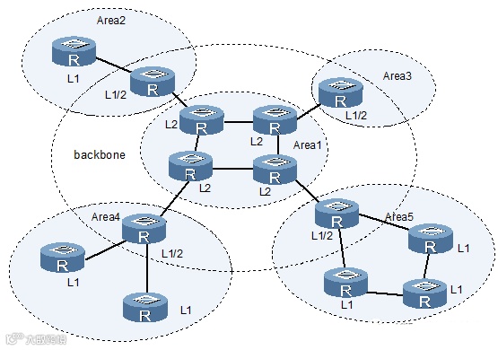 OSPF和ISIS都是存在区域的概念,ISIS存在两种区域进行分层,骨干区域和非骨干区域。非骨干区域连接着骨干区域。