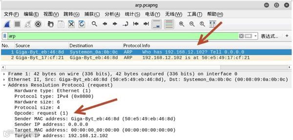 其中,第 2 个数据包为 ARP 响应数据包。在 Address Resolution Protocol(reply) 部分中,Opcode 的值为 reply(2),表示该数据包为 ARP 响应包;Sender IP address 的值为 192.168.12.102,表示此时源主机为目标主机;Sender MAC address 的值为 Giga-Byt_17:cf:21(50:e5:49:17:cf:21),表示 50:e5:49:17:cf:21 为目标主机 192.168.12.102 的 MAC 地址。