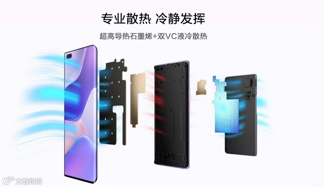 这款Hi nova 9系列的手机,采用双VC液冷散热器+超高导热石墨烯散热片的散热方案,高效的趋热能力,让热情尽情高涨!就算边打游戏边充电,也不会发烫的哟~