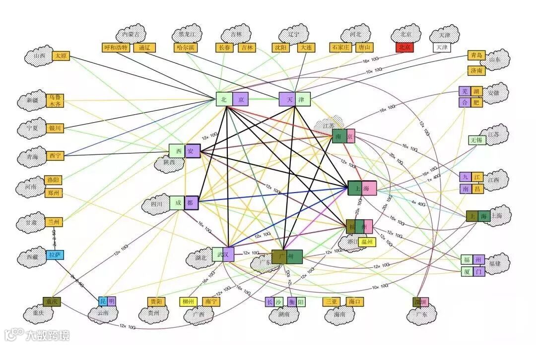 运营商/公安/金融骨干网节点全是路由器,中国电信Chinanet 骨干节点也是高端路由器,拓扑图如下:
