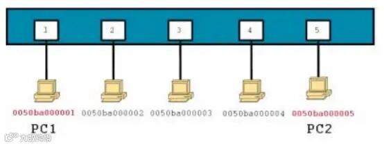 但是,只要有过成功通讯后,交换机会把来源节点的 MAC 地址和端口对应关系记录在本机的“MAC 地址表”中,也就是会把 PC1 的 MAC 地址对应端口 1 的关系记录下来,同理 PC2 的 MAC 地址也会记录对应端口 5。表项类似:“0050ba000001(PC1 的 MAC 地址)=端口 1”、“0050ba000005(PC2 的 MAC 地址)=端口 5”。