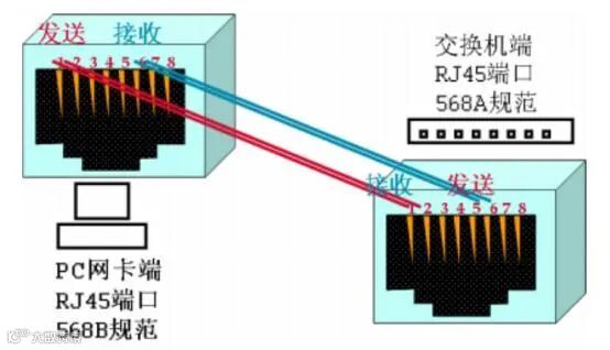 当然,如果两端的端口都是 PC 网卡的接口,两端同样是 568B 规范,也就是说一样需要手动跳线,即使用交叉线连接,这里就不给出图例了。