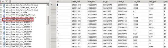 确认统计数据是否成功地存入了数据库,正常情况下10分钟左右应该可以在数据库中看到有*tbl_nets_*的表生成,此表中记录的是接收到的原始日志数据,如下图6: