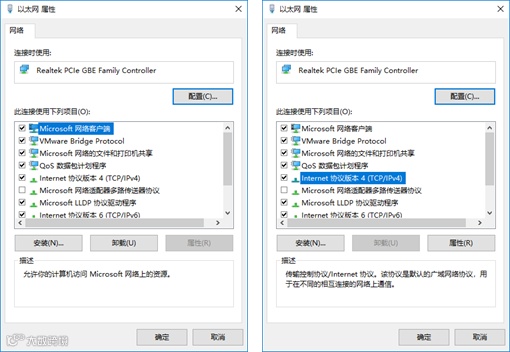 步骤5:单击“属性”按钮,弹出“以太网属性”对话框,选择“Internet协议版本4(TCP/IPv4)”选项,如图1-13所示。