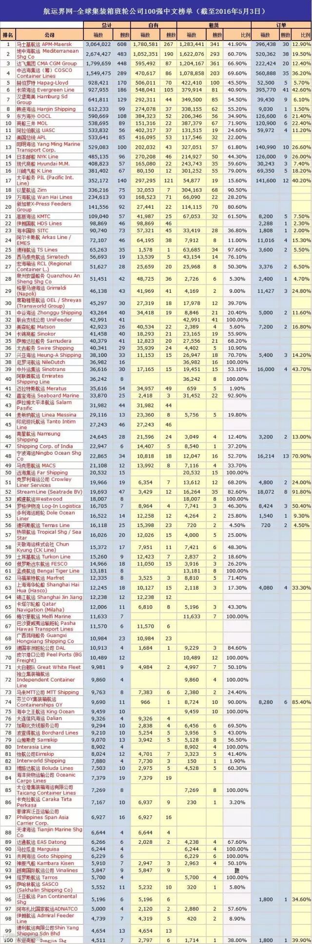 根据Alphaliner最新运力数据显示,截止至2016年5月3日,全球班轮公司运力100强中马士基航运排第一,地中海航运排第二,法国达飞轮船排第三,整合后的中远海集运(筹)排在第四位,赫伯罗特排第五,台湾长荣海运排在第六。第七名到第十名分别是:汉堡南美、韩进海运、东方海外与商船三井。