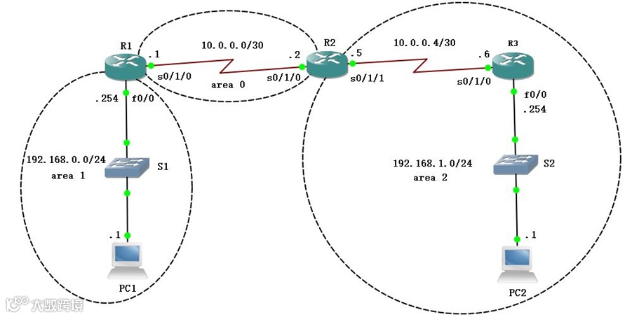 完成多区域OSPF和OSPF虚链路的配置,实现计算机PC1和PC2互通。