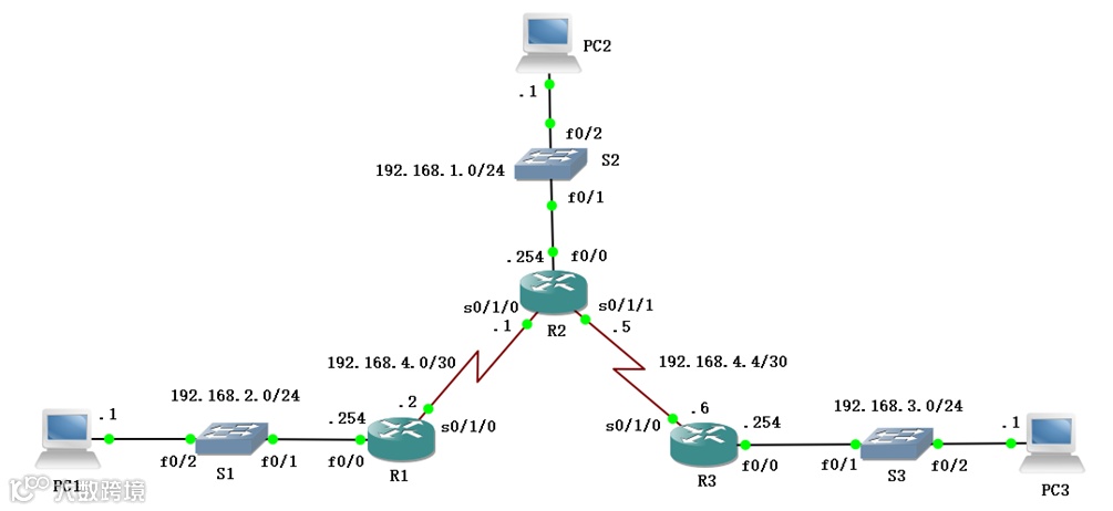 网络拓扑图中,3台路由器R1、R2和R3互联了5个网络,路由器R1有3个非直连网络,路由器R2有2两个非直连网络,路由器R3有3个非直连网络,因为路由器R1、R2和R3没有去往非直连网络的路由,所以网络无法互通。要实现网络的互通,可以在路由器R1、R2和R3配置OSPF。