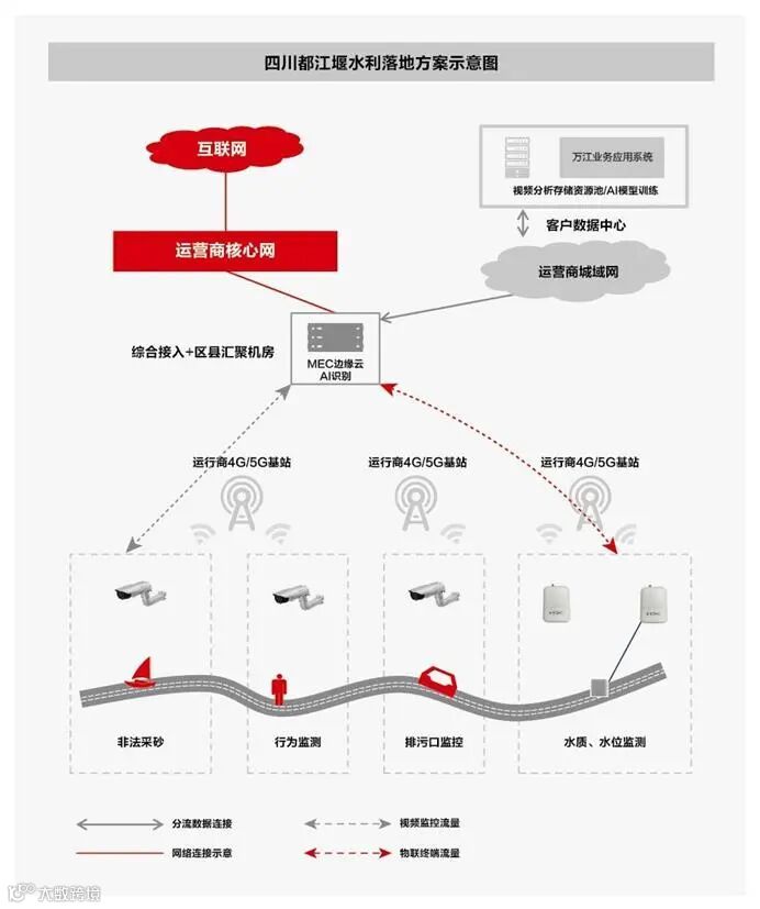 都江堰水利,是全国首创的5G MEC智慧水利业务,方案融合了5G、视频监控、MEC边缘云和AI人工智能,同时中心云与边缘云功能协同,实现全方位水环境监测预警。
