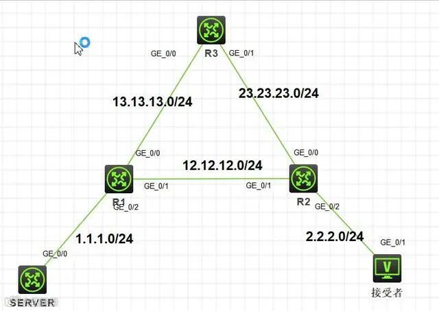 如图所示,通过OSPF 协议从R1接受来的源1.1.1.1是最优的,现在我们要求实现接受者能够通过R1-R3-R2这条与单播路径R1-R2不同的方式接收组播信息。