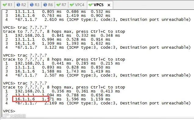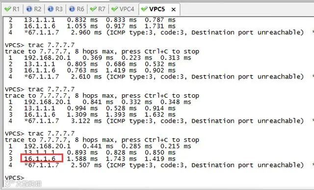 当E0/1线路或故障接口down,PC5从R6出去,转换成16.1.1.1