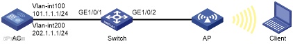 ·AC:#vlan 100#vlan 200#dhcp server ip-pool for_aps network 101.1.1.0 mask 255.255.255.0 gateway-list 101.1.1.1#dhcp server ip-pool for_clients network 202.1.1.0 mask 255.255.255.0 gateway-list 202.1.1.1#wlan service-template 1 clear ssid market_department bind WLAN-ESS 1 authentication-method open-system service-template enable#interface Vlan-interface100 ip address 101.1.1.1 255.255.255.0# interface Vlan-interface200 ip address 202.1.1.1 255.255.255.0#interface GigabitEthernet1/0/1 port link-type trunk port trunk permit vlan 100 200#interface WLAN-ESS1port link-type hybrid undo port hybrid vlan 1 port hybrid vlan 200 untagged port hybrid pvid vlan 200 mac-vlan enable#wlan ap officeap model WA2620E-AGN serial-id 21023529G007C000020 radio 2 type dot11gn service-template 1 radio enable# dhcp enable#·Switch:#vlan 100#vlan 200#interface GigabitEthernet1/0/1 port link-type trunk port trunk permit vlan 100 port trunk pvid vlan 100#interface GigabitEthernet1/0/2 port link-type access port access vlan 100 poe enable