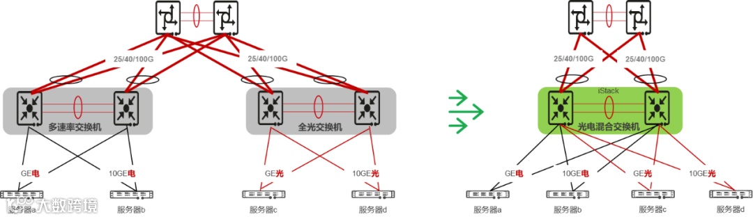 为了满足不同业务承载和成本管控需求,小微型数据中心通常同时存在光口及电口服务器,网络部署时需同时提供两套交换机堆叠系统,即一套全光交换机和一套全电交换机,至少四台交换机,这给部署和运维增加了负担。