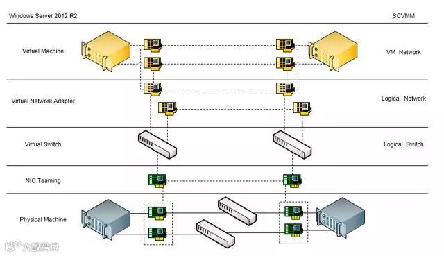 在Windows 2012 R2中的网络虚拟化小节中,我们提到了在操作系统层面发生的关于网络配置的改变包含:网卡组、虚拟交换机,虚拟网卡。很容易发现这些配置其实只针对某个物理服务器或者某个虚拟机(虚拟网卡可用于虚拟机),那么这些物理服务器和虚拟机的虚拟网卡如何算是连接在同一个网络中,其实非常容易想到的就是我们必须在物理网络的基础上,为这些物理服务器和虚拟机进行相同的配置,让他们拥有同样的虚拟交换机和虚拟网卡的配置,那么整个虚拟化平台就能正常工作了。因而在SCVMM上所做所有工作其最终目的就是为了在多个物理服务器和虚拟机之间实现配置的一致性,当然最终也带来的配置的便捷性。