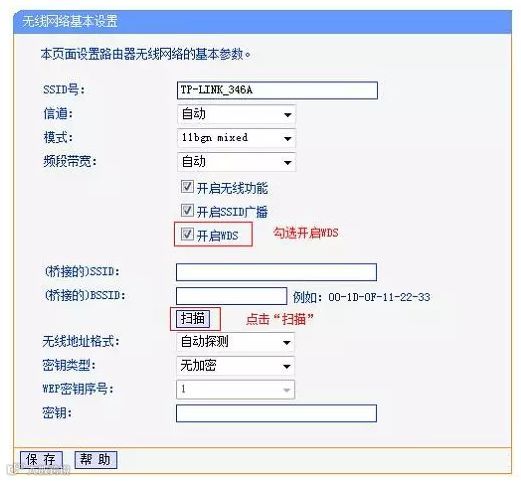 2,打开路由器B的无线基本设置,勾选WDS,然后扫描到第一台路由器。