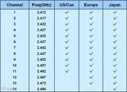 信道1 的中心频率为2.412GHz,信道2 的中心频率为2.417GHz,依此类推至位于2.472GHz 的信道13 。