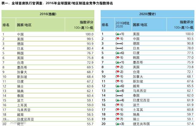 中国信息化百人会与德勤联合发布报告称,中国目前仍是全球最具竞争力的制造业国家,但由于中国在人才、创新、能源政策、基础设施、法律环境方面表现尚待提高,到2020年,美国或将反超中国,成为第一。