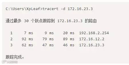 在上面的网络环境中,在网络通的情况下,我们在电脑上使用命令tracert -d命令,会得到下面的结果: