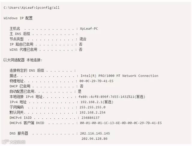 主要是要确保所设置的DNS服务器地址到底有没有提供域名解析服务或者是否出现了故障,至于如何判断,后面会给出方法,这里关注的是,你得设置一个正确的DNS服务器地址或可以自动获取。在windows上面你可以通过下面的命令查看:
