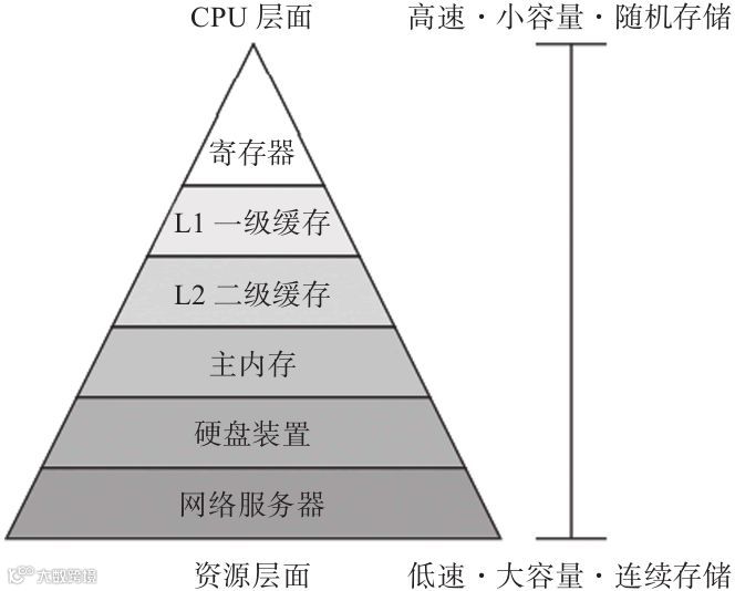 如图 7 所示,即从存储容量和 I/O 读取速度的角度,对服务器中各个硬件做了比较。可以看到,硬盘 I/O(读取)性能相比内存差很多,目前解决这个问题的普遍方法是先将大量的数据从硬盘缓存到内存,也就是说写入到缓冲区中,这也是当今互联网网站解决访问速度慢的必备方案。