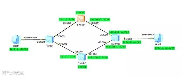 如下图所示,局域网主机通过Switch双归属到部署了VRRP备份组的SwitchA和SwitchB,其中SwitchA为Master。