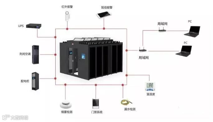 模块化数据中心采用行级水平送风空调进行制冷。