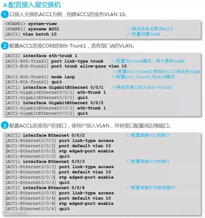 这里接入层就以交换机 ACC1 ( S2750 ) ,核心交换机 CORE ( S5700 ) 和出口路由器 Router ( AR 系列路由器) 为例。
