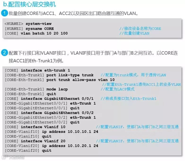 1、接入交换机与核心交换机通过 Eth - Trunk 组网保证可靠性。