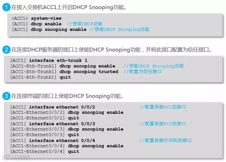 配置了DHCP功能之后,部门内用户主机可以自动获取地址。但是为了防止员工在内网 私自接一个小路由器并开启DHCP自动分配地址的功能,导致内网合法用户获取到了私 接的小路由器分配的地址而不能正常上网,还需要配置DHCP Snooping功能。