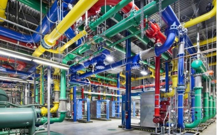 谷歌俄勒冈数据中心的这些彩色管道负责输送水。蓝色管道装冷水,红色管道装热水。