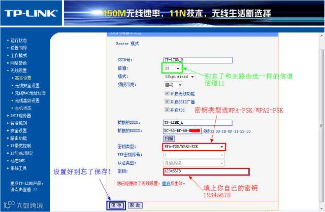 SSID自己喜欢,但不要与主路由相同,本例以TP_LINK-B为例