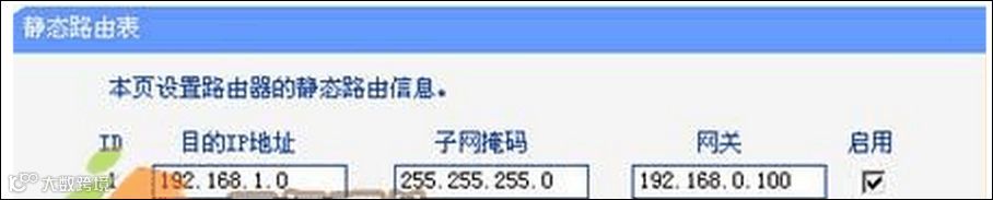 目的地址为192.168.1.0,掩码255.255.255.0,下一跳(网关)为192.168.0.100