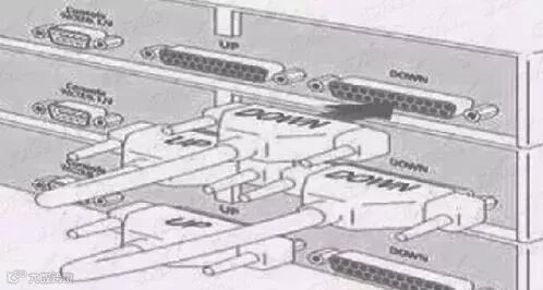 交换机的堆栈连接端口通常是又排D形插孔的,一个交换机有两个这样的端口,分别标有“UP”和“DOWN”字样(如上图所示),表示对应用于向上和向上堆栈连接的,不能接错。