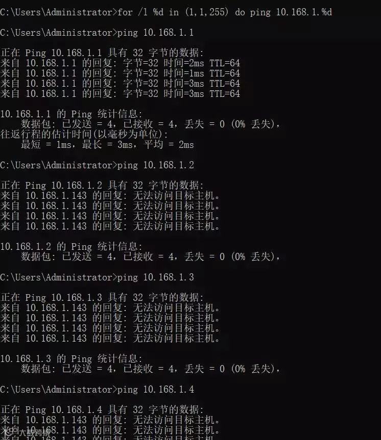 当输入批量命令后,那么它就自动把网段内所有的ip地址都ping完为止。