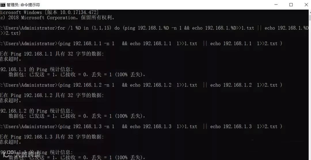 上面的命令虽然能批量ping 地址,但是上面代码在命令行窗口显示数量多的时候看起来也很麻烦,那么我们再升级一下,用下面的代码。