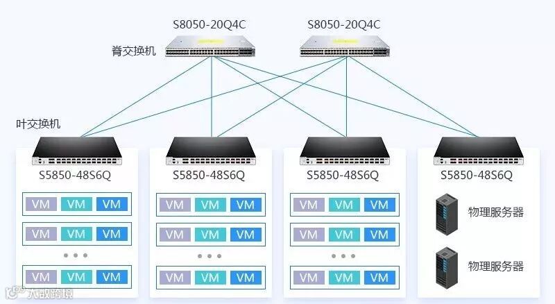 无论是核心层、汇聚层还是接入层,都属于比较传统的网络结构,目前比较先进的是叶脊拓扑结构,主要网络结构设计,如下图所示: